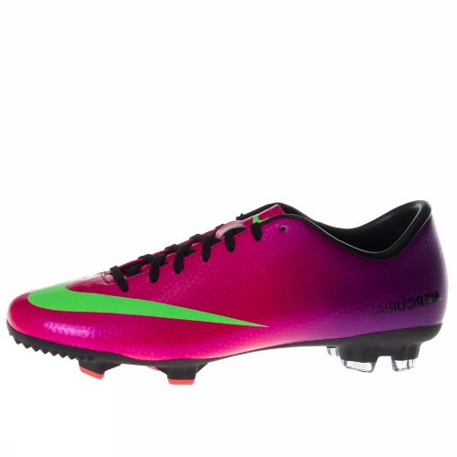 Built for speed, these high performance Mercurial Victory IV FG Rugby Boots further enhance Nike's status at the pinnacle of boot design. Created as a takedown and more affordable option to the high-end Mercurial Vapor IX, this model still achieves a lightweight design courtesy of the strong yet soft synthetic upper. Taking inspiration from the dimpled surface of a golf ball and featuring debossed microgrooves, this approach has been applied to quite simply reduce air resistance and enhance ball control. A configuration of moulded studs ensure light work is made of natural firm surfaces and leave you with plenty of acceleration and manoeuvrability across the pitch, whatever your position. The Nike design team have been at it again and just when you thought they didn't have any more colours to work with. For high visibility, take a dynamic fire berry tone and have this fuse with prime purple for a look that is brave but a highly successful colour combination. With the inclusion of the Nike swoosh decorated in electric green wrapped around the toes, it is left to the Nike branding in white to cool down proceedings. *b*These rugby boots weigh 245g each (UK size 8)*b*